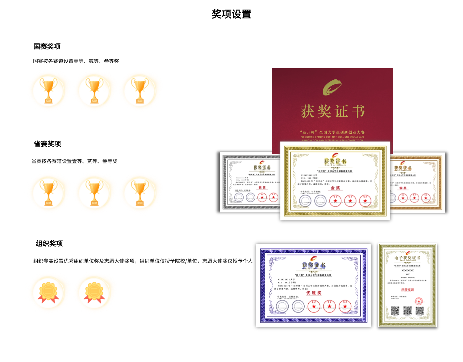 本届大赛设有:“经开杯”全国大学生创新创业大赛-智能创新&青年创业赛道、全国大学生数字艺术设计大赛、全国大学生双创能力挑战赛、全国大学生双创英语词汇大赛共四个赛项。